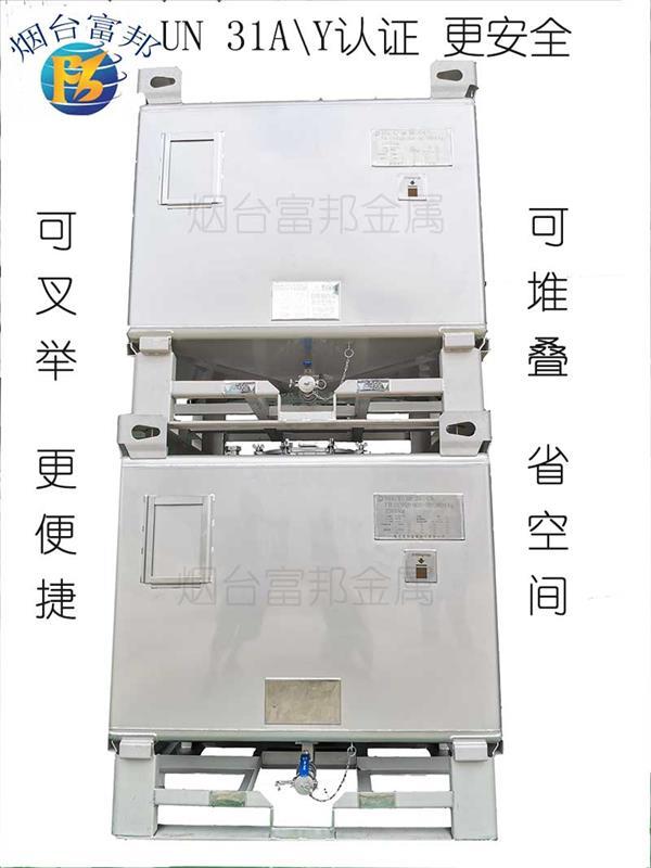 烟台富邦所设计生产的不锈钢1000L ibc吨罐,具有UN31A\Y之外的中国危包证双重认证,设计为无框架的紧凑样式,可用于栏板车、厢式车、海运集装箱等双层运输,中央2寸的进料口更加为客户装料增加了便利性,精选可靠的美国进口呼吸阀(带正负压)为IBC吨桶的操作增加了安全性。
